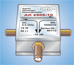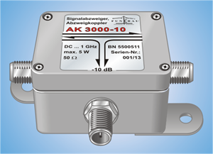 AK 2500-XX, Signal Splitter, Splitting Coupler DC ... 1,0 GHz, in tin plate housing, 3 x SMA (f) connectors More Info |