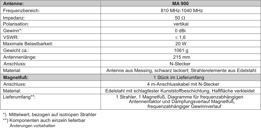 Datenblatt für MA 900 GSM, Mess-Antenne (Data sheet for MA 900 GSM, Measuring Antenna) [pdf]